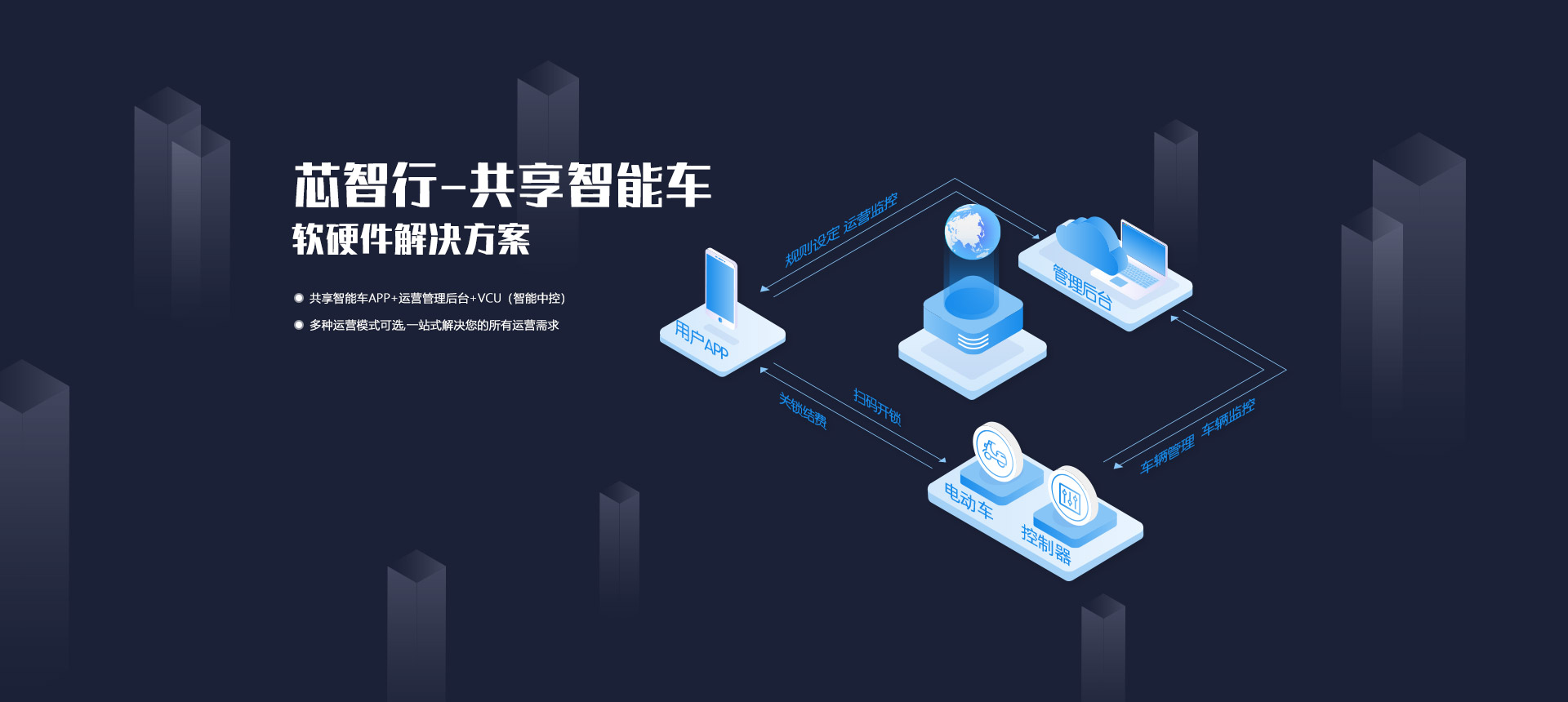 共享智能車APP + 運(yùn)營管理后臺 + VCU(智能中控)= 一站式解決方案